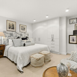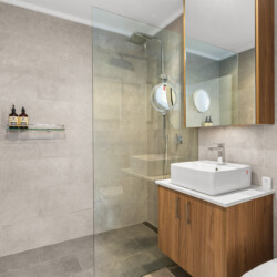 Designer bathroom with a custom vanity, rainfall shower & auto night lighting.